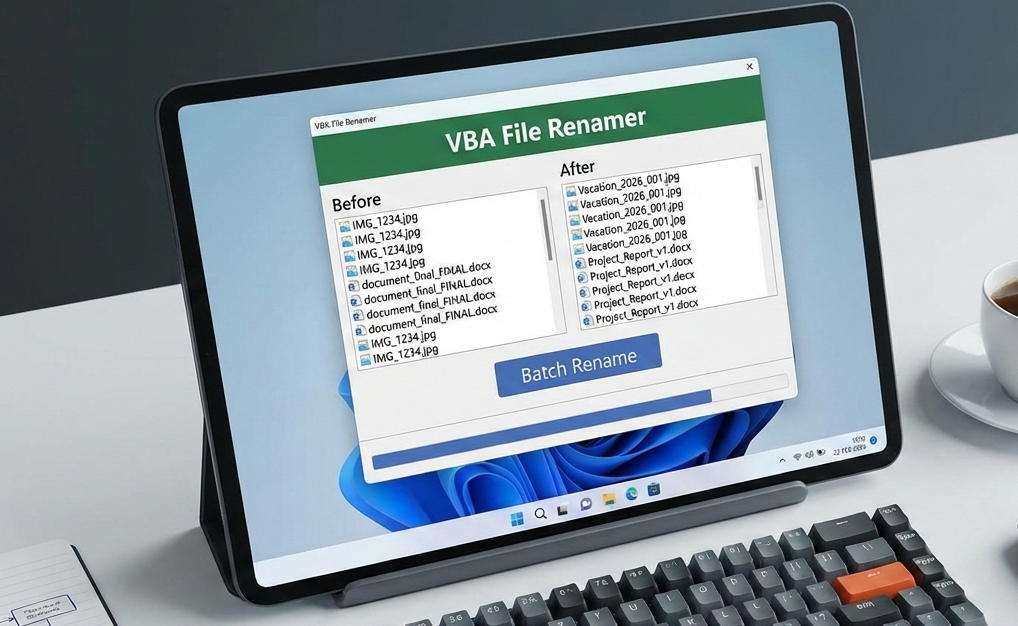 An automated VBA utility that transforms tedious manual file renaming into a fast, error-free, and single-click process.